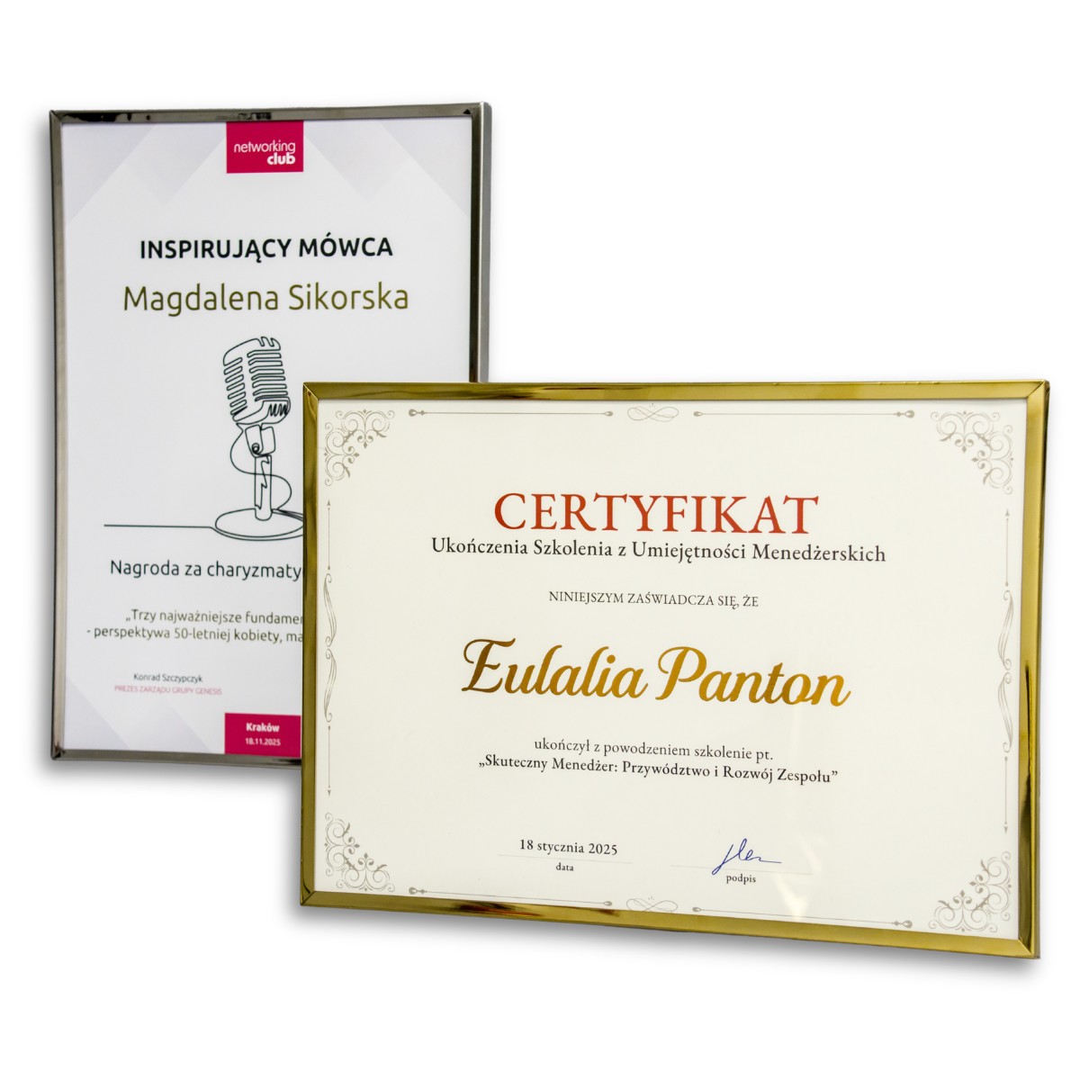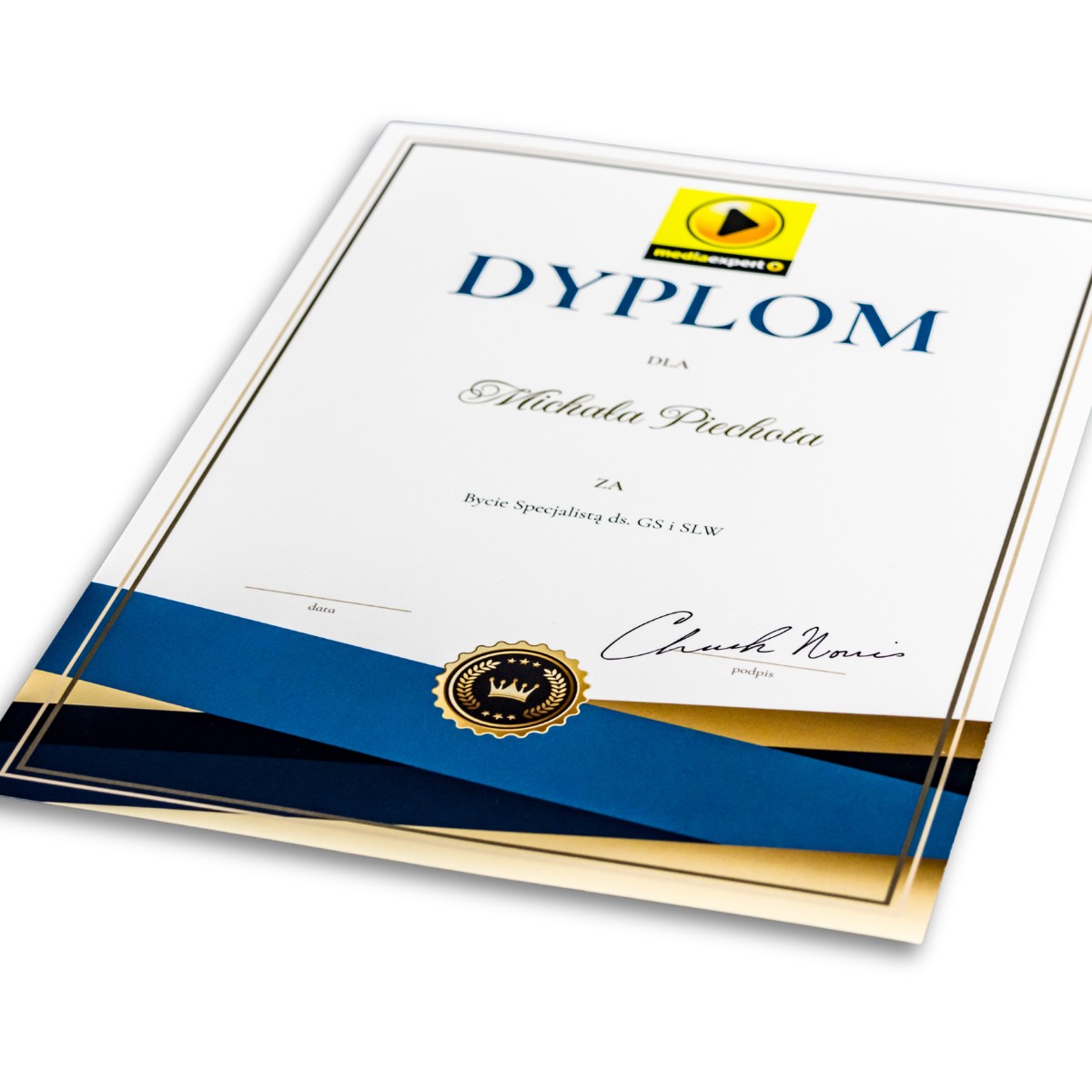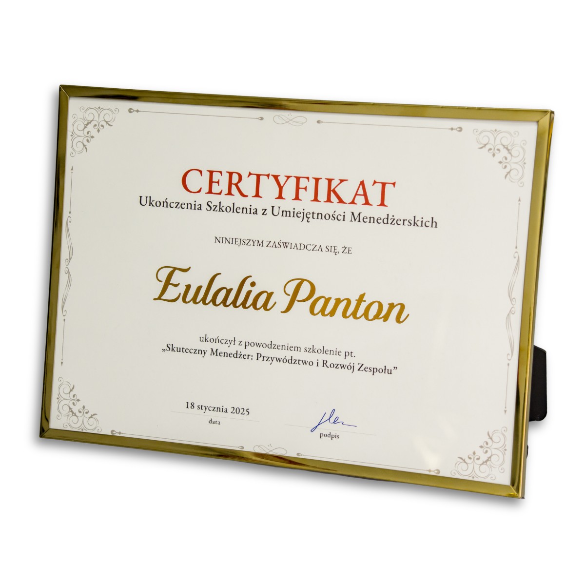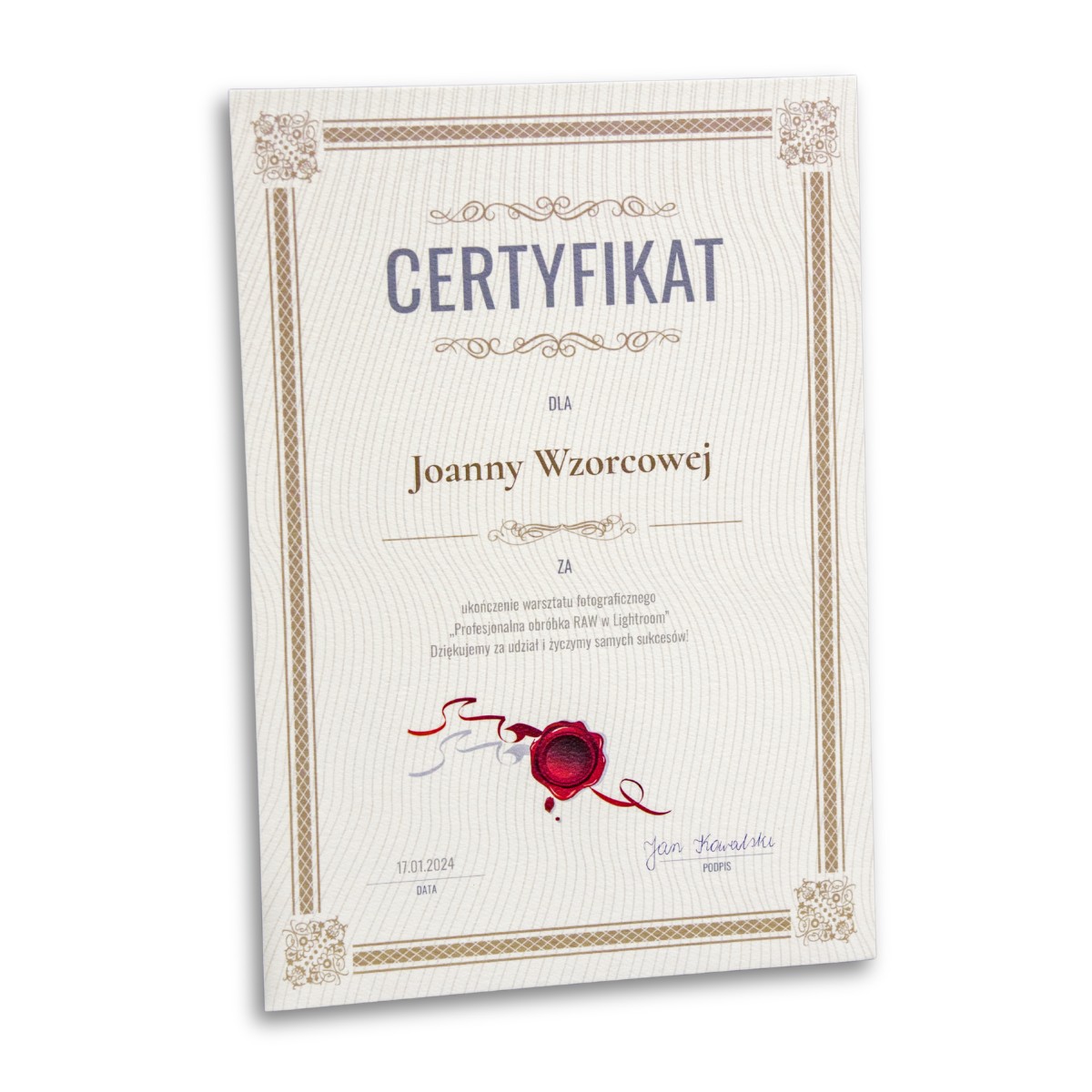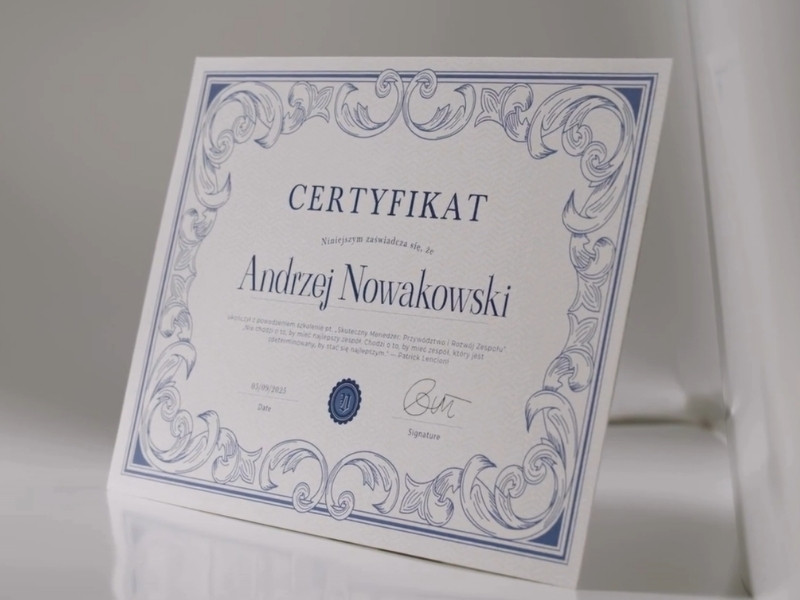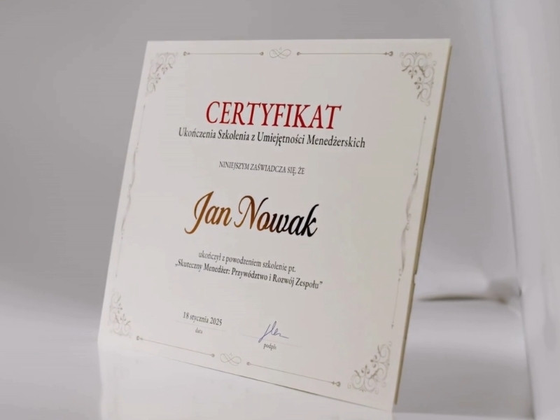 Dajemy Ci pełną swobodę: możesz skorzystać z naszej bogatej biblioteki profesjonalnych wzorów na każdą okazję lub przesłać nam autorską grafikę. Dzięki temu Twoje certyfikaty będą zawsze spójne z identyfikacją wizualną Twojej marki lub wydarzenia.