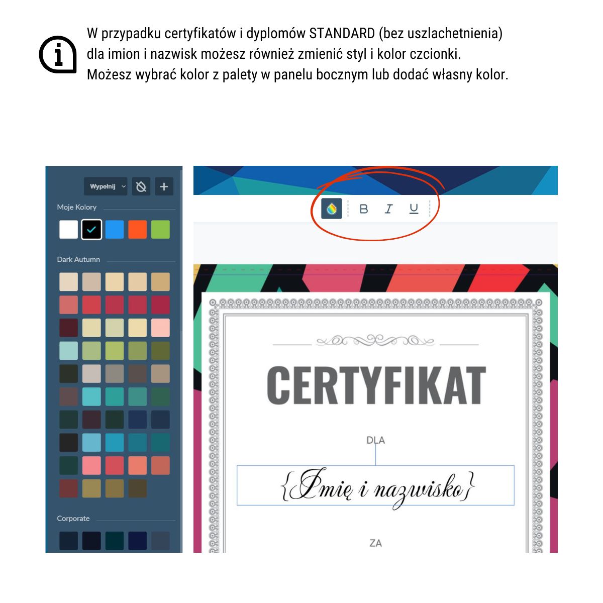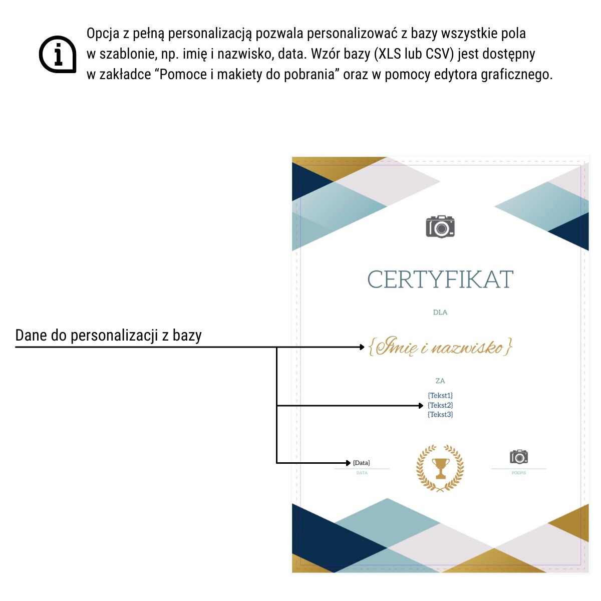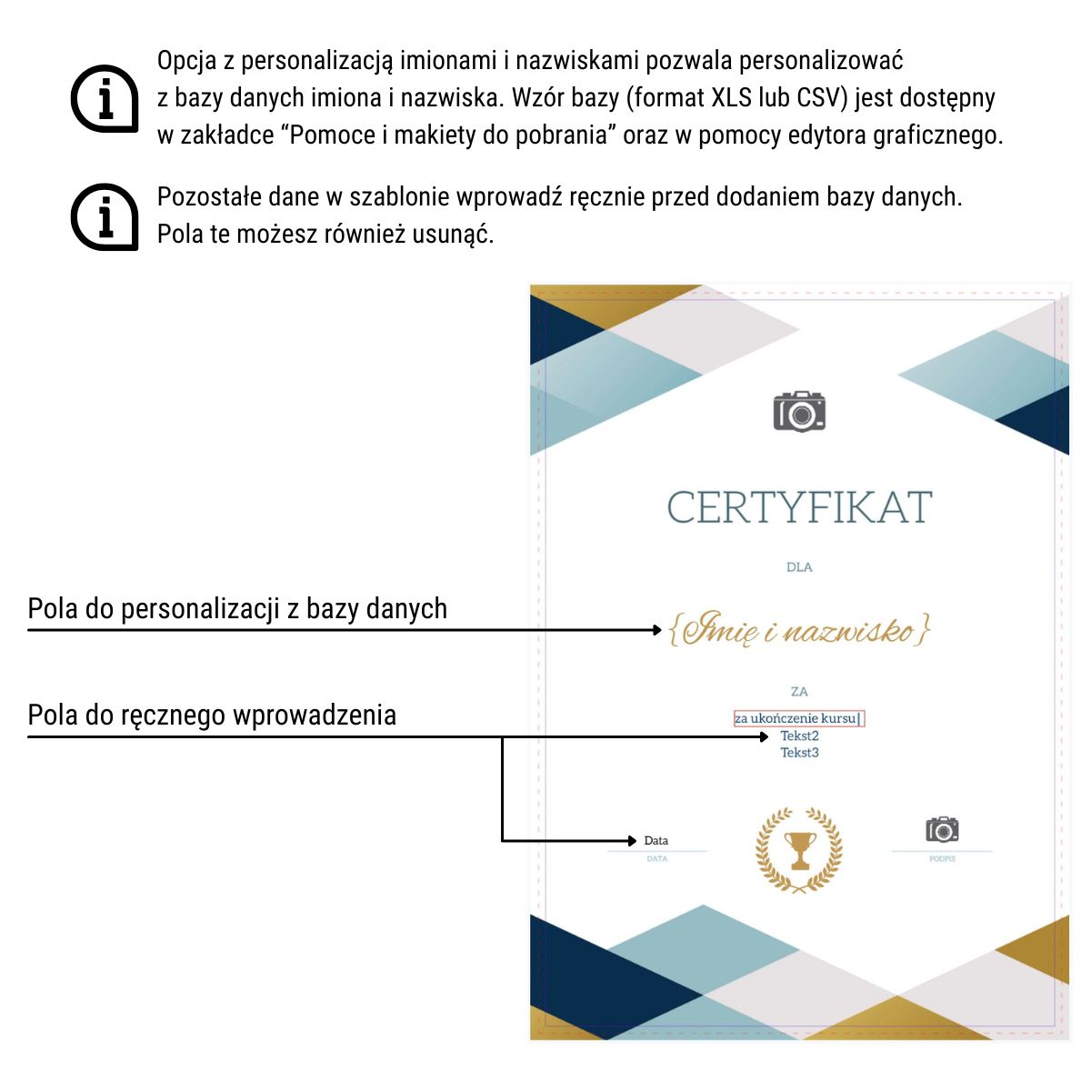 Skorzystaj z gotowych szablonów na różne okazje i wydarzenia, a następnie dodaj personalizację z bazy danych Excel lub CSV. W ramach personalizacji możesz dodać imiona i nazwiska, własne teksty oraz daty i podpisy.