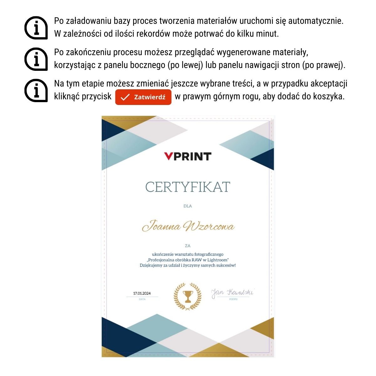 Materiały sprawdzą się na ukończenie kursu, szkoły, szkolenia, a także na wyróżnienia i miejsca w konkursach czy zawodach.
